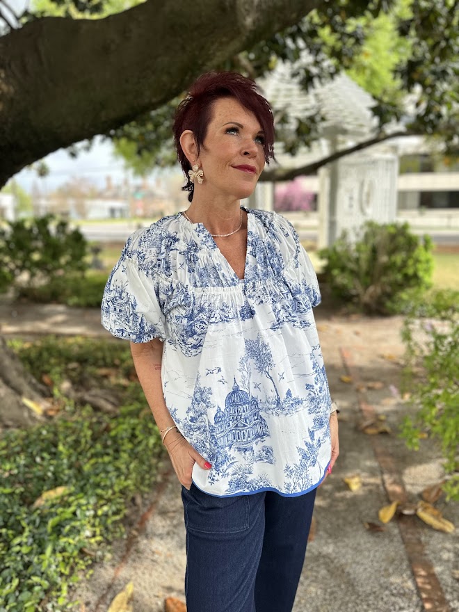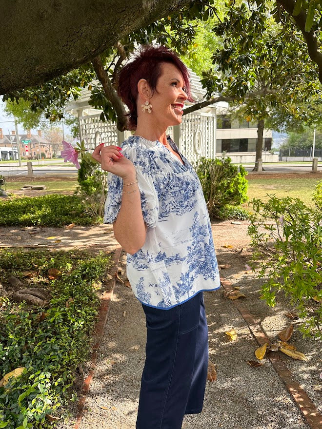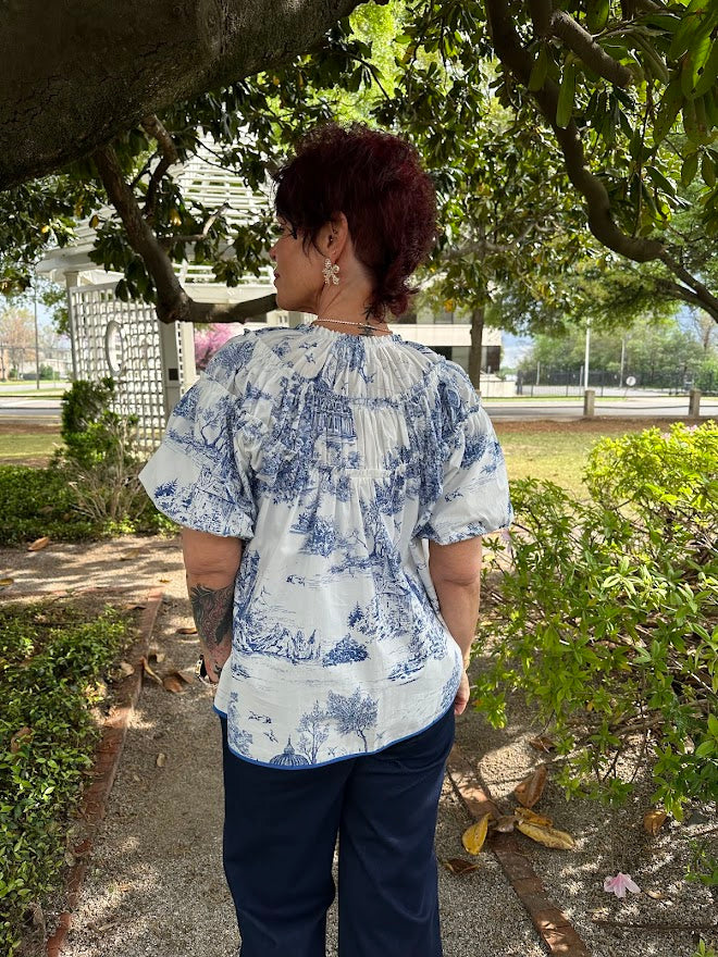 Bubble Sleeve Toile Print Top with Shirred Neckline