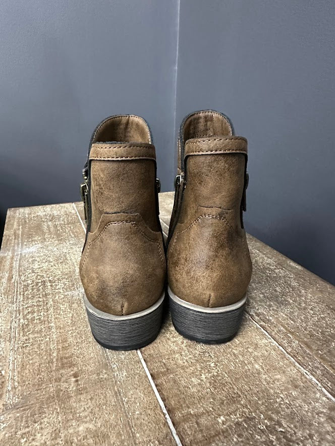 Meet your new go-to bootie: the Evie Bootie by Very G. With its distressed brown finish, side zipper detail, and low stacked heel, this bootie blends comfort and style effortlessly. The easy side-zip closure makes slipping them on a breeze, while the cushioned insole keeps you comfortable from coffee runs to concerts. Whether paired with jeans, dresses, or skirts, the Evie Bootie adds a touch of rustic charm that works year-round.