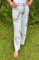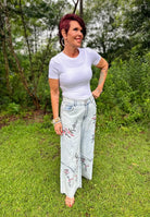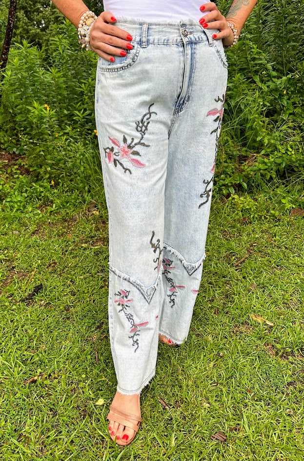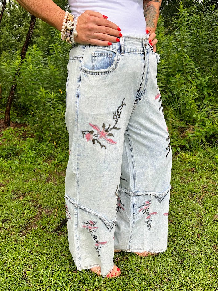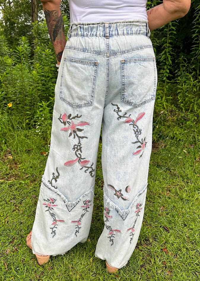 These aren't your average jeans—these are wearable art. The Meadow Bloom jeans bring vintage charm and modern edge together with gorgeous floral embroidery scattered throughout a softly washed, light denim. Featuring a flattering wide leg, subtle distressing, and detailed V-seam patches near the knee, these jeans bring personality to every outfit.