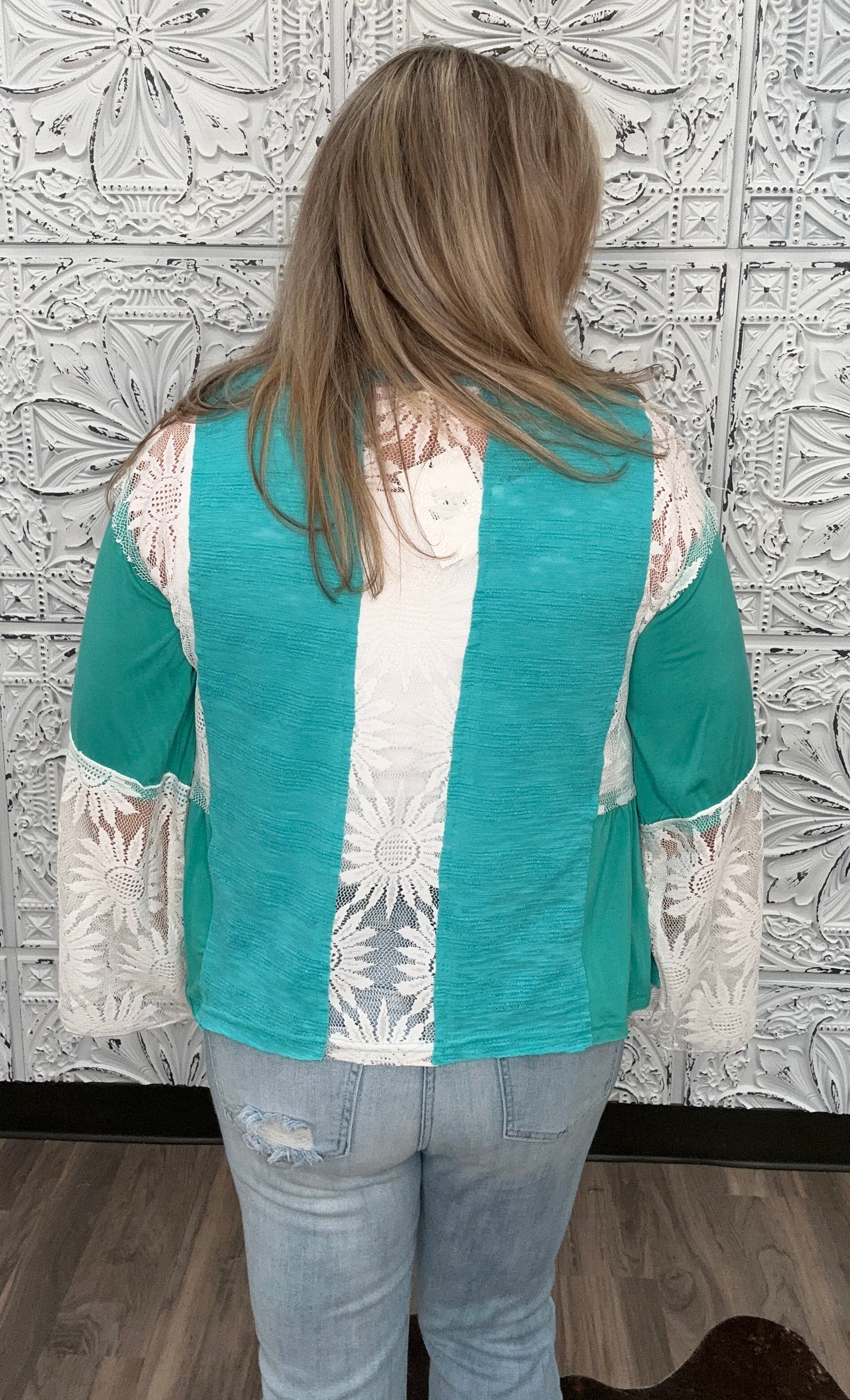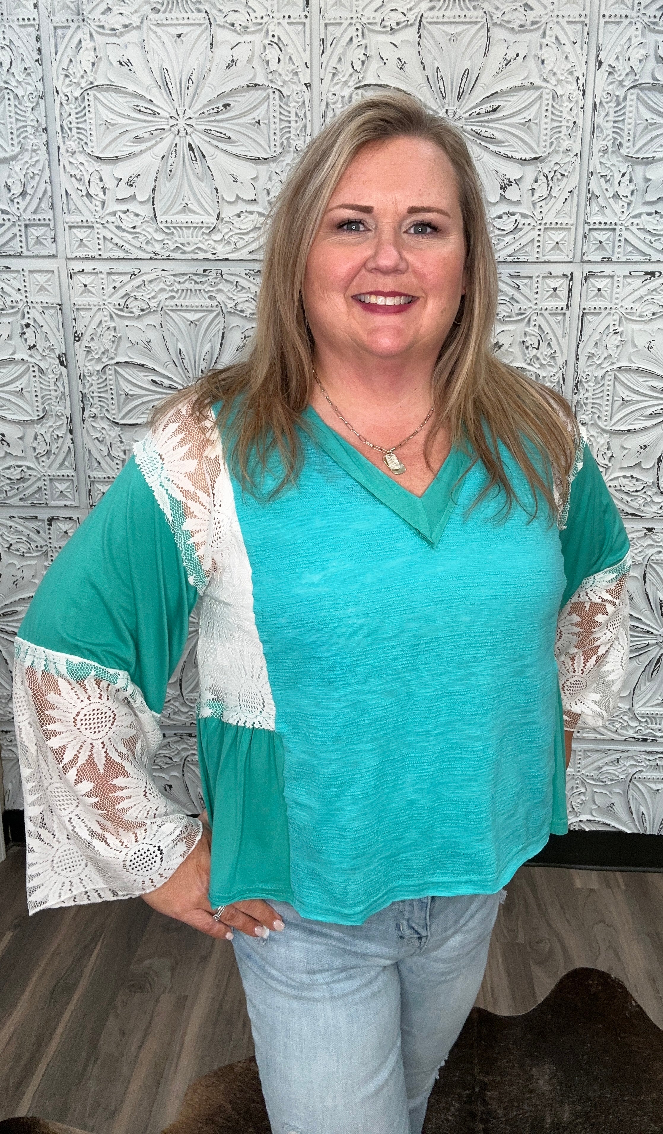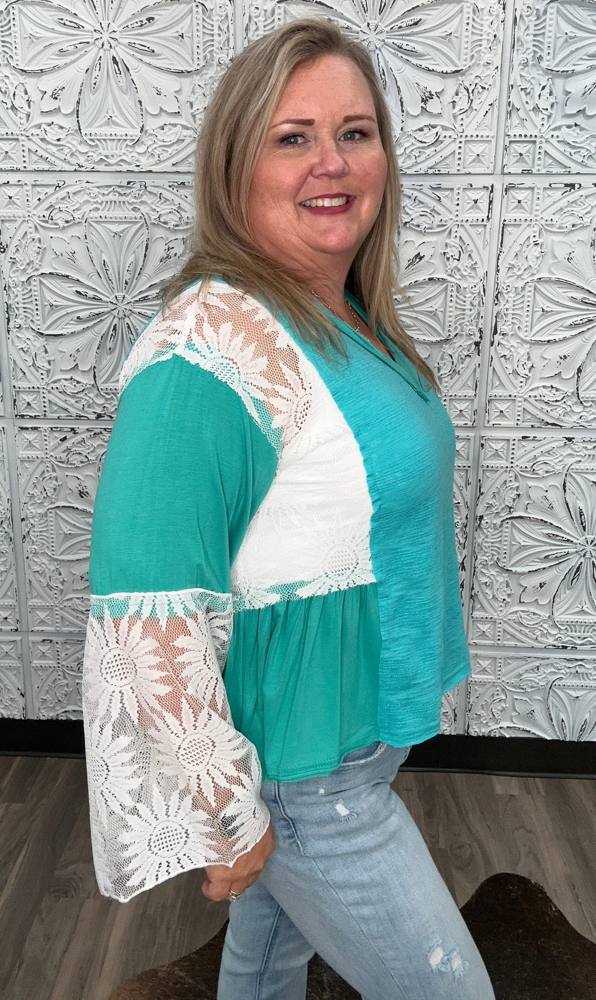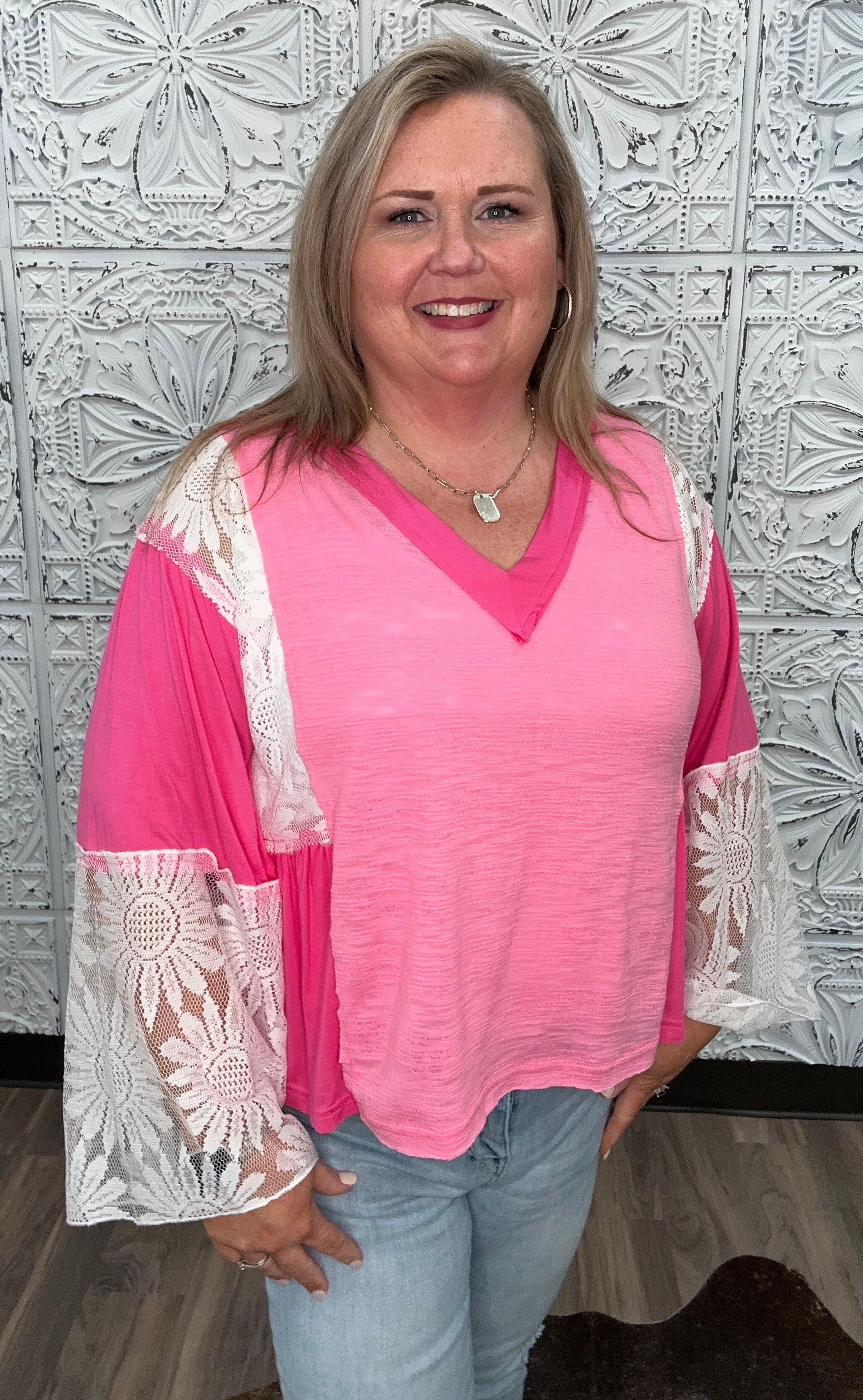 Boho meets bold in this Two-Tone Lace Sleeve V-Neck Top, available in Barbie Pink or Aqua! Featuring a soft, lightweight fabric, this top combines a relaxed fit with a striking color block design for effortless style. The flowy bell sleeves are adorned with intricate lace detailing, adding a touch of elegance and femininity. The flattering V-neckline makes it perfect for layering with your favorite jewelry. Whether paired with jeans for a casual-chic look or dressed up for a night out, this top is a statement piece you’ll reach for again and again! Laura is wearing the size Small.