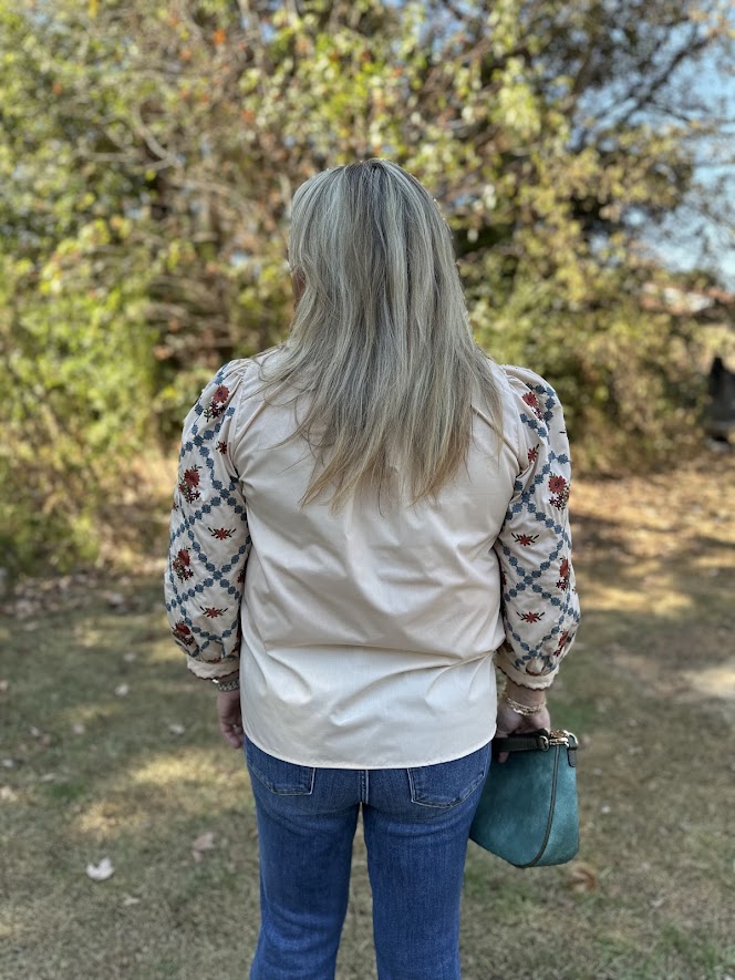 ✔️ Ecru body with embroidered 3/4 sleeves
