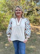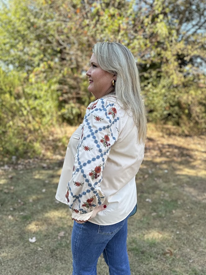 Lightweight and lovely, this embroidered pullover is the perfect blend of casual comfort and unique detail. Designed in a soft ecru hue, it features 3/4 length sleeves with colorful embroidery and a contrast scallop trim neckline that adds a touch of charm. The woven, unlined fabric makes it breathable and easy to style year-round.