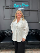 A timeless wardrobe essential that works from weekday meetings to weekend plans. This Classic White Button-Down Shirt is designed with an easy, relaxed fit that flatters without clinging. Featuring a crisp collar, front pocket, and a length that pairs perfectly with pants or leggings, this top is one you’ll reach for again and again. Dress it up with trousers and heels for work, or keep it casual with denim and sneakers—it’s the ultimate “goes with everything” piece.