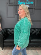 A throw-on-and-go favorite with edge. This 100% cotton French terry pullover has that vintage acid-wash look, raw-edge chest pocket, and—yes—hand pockets. Double back seam and a back patch add subtle structure. Cozy for errands, cute for game day, and perfect with denim or leggings.