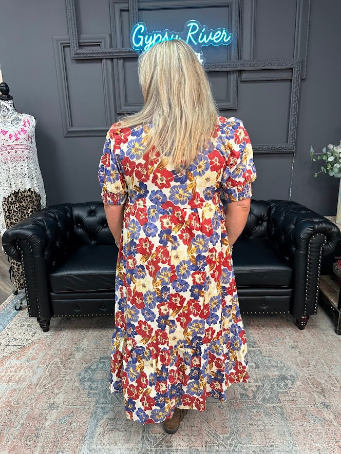 floral peasant dress, boutique floral dress, puff sleeve dress, v notch dress, women’s floral dress, casual midi dress