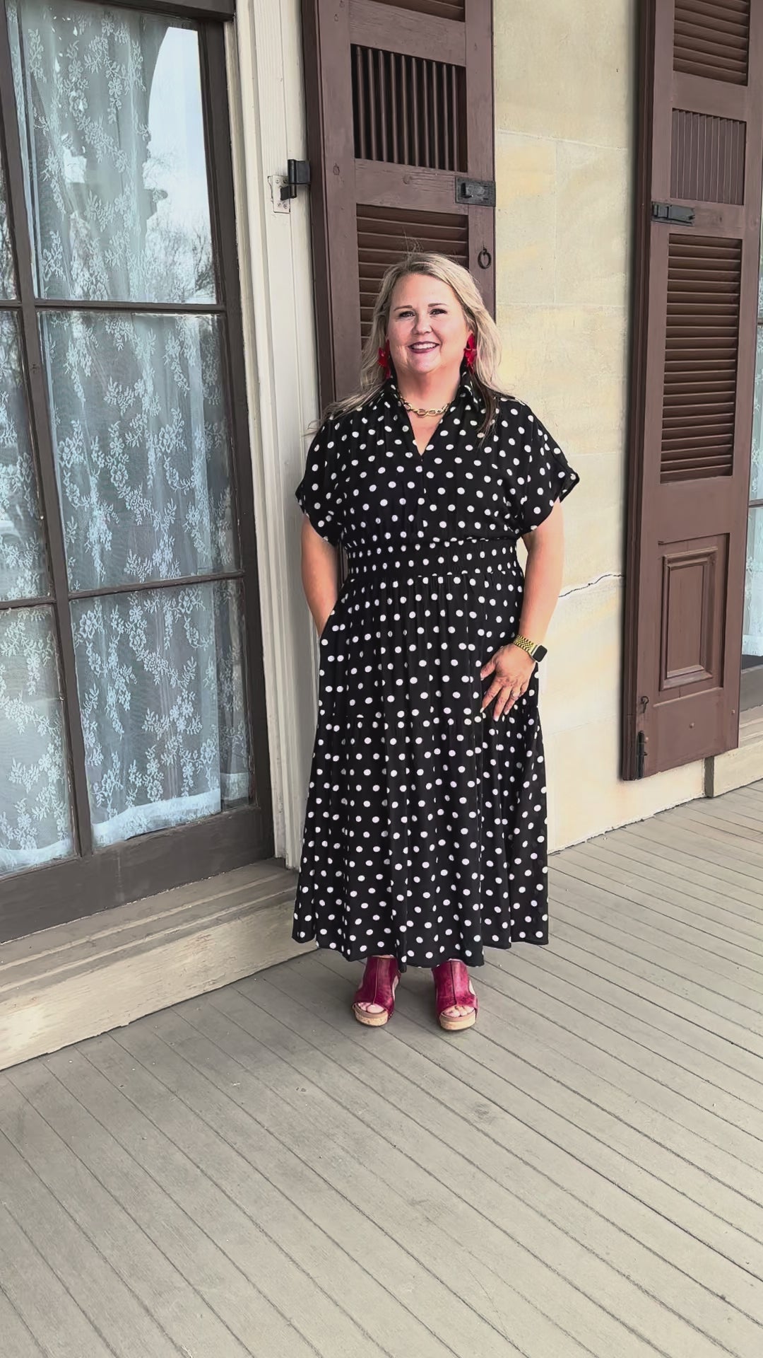 This classic black-and-white polka dot dress is the definition of effortless polish with an easy, everyday feel. The smocked waist gives you shape without clinging, while the flowy midi length and pockets make it a true wear-all-day favorite.