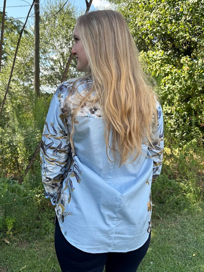 Fresh, feminine, and oh-so-easy to wear. This woven blouse features a soft blue base with painterly floral prints and accent sleeves that add a touch of drama. The ruffle-finished V-neckline and button-front closure give it a polished look, while the lightweight fabric keeps it breezy and comfortable. Perfect for work, church, or a dressy-casual dinner out.