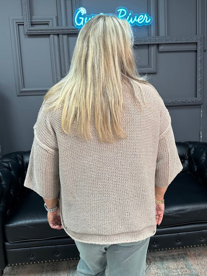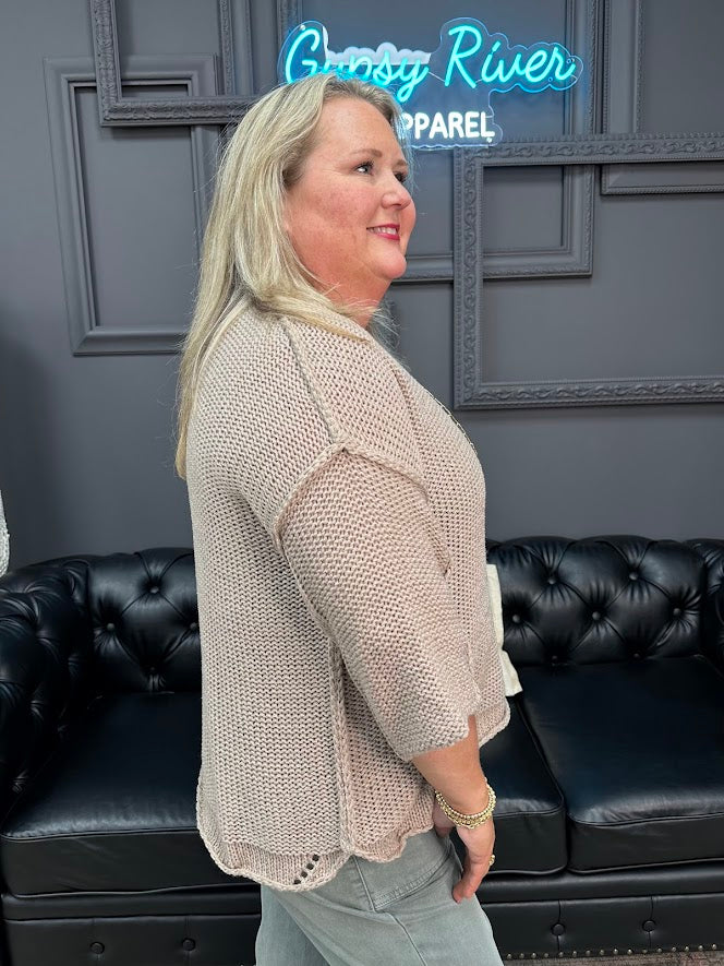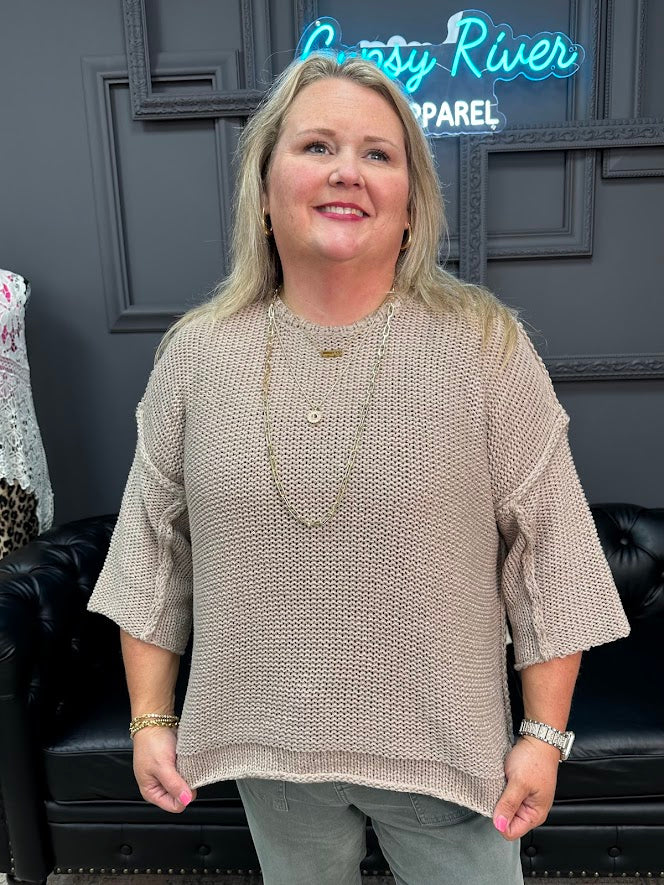 Effortless, breezy, and just the right amount of cool. This boxy knit pullover features a rounded neckline and easy half sleeves for year-round wear. Exposed “inside-out” seams add texture, while side slits and a subtle crochet finish at the hem give it that boutique touch. Toss it on with denim now and layer over a tank or dress when temps dip—she’s a go-to.