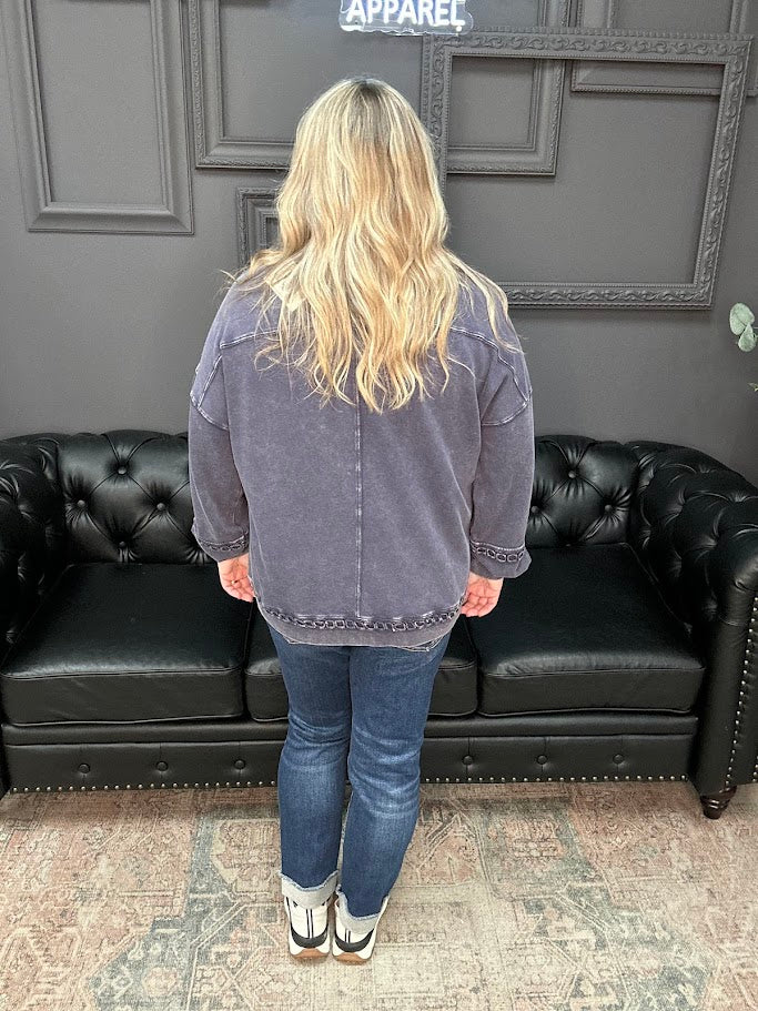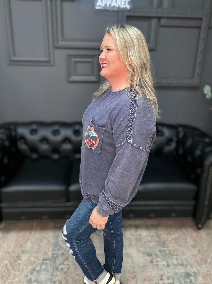 Comfy meets cool in this laid-back pullover with vintage vibes. Designed in a mineral-washed terry fabric, this sweatshirt has a relaxed, oversized fit with dropped shoulders and a classic crew neckline. The standout detail? A front chest pocket featuring a cherry graphic, plus eyelet lace trim accents for a touch of unexpected charm. Ribbed cuffs and hem finish off the cozy look.
