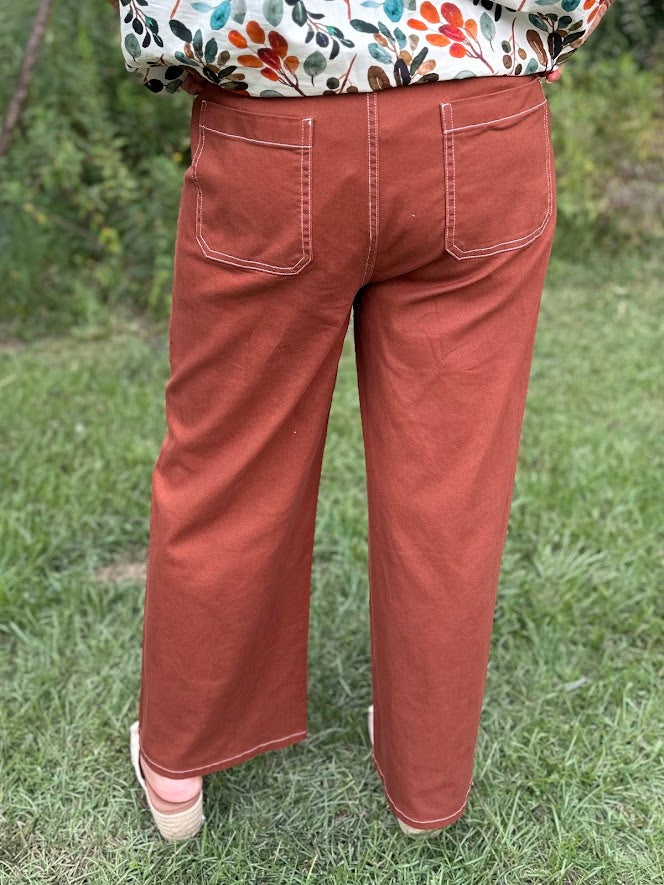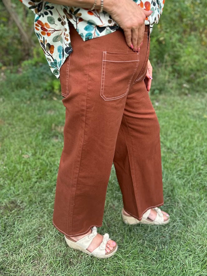 Camel High-Waist Exposed Stitch Wide Leg Pants
