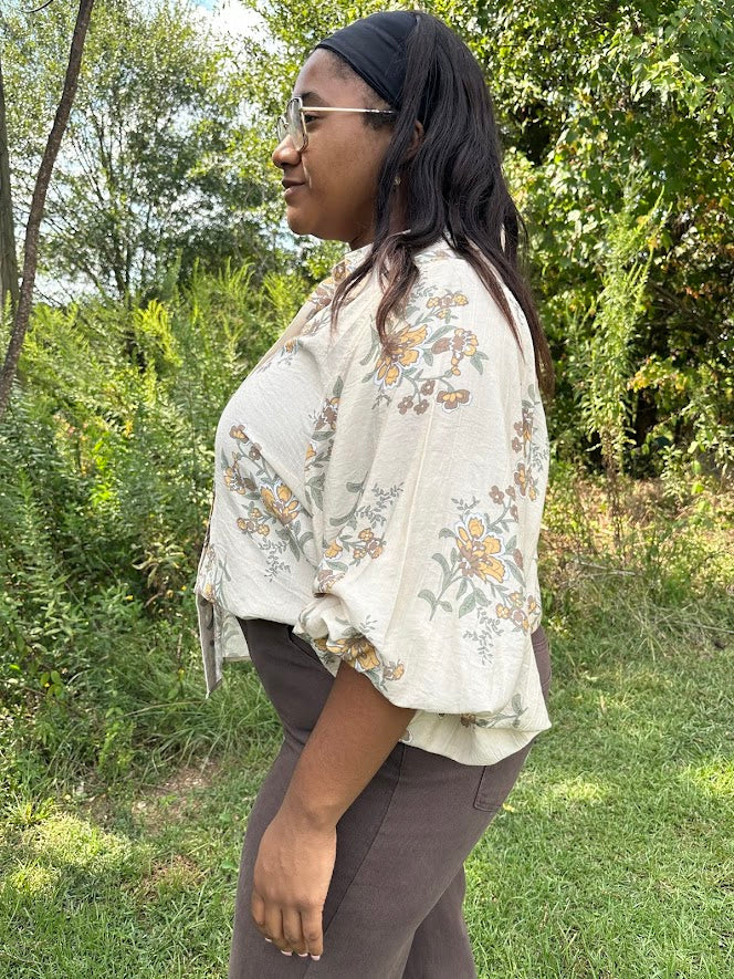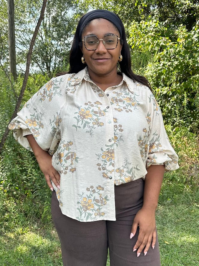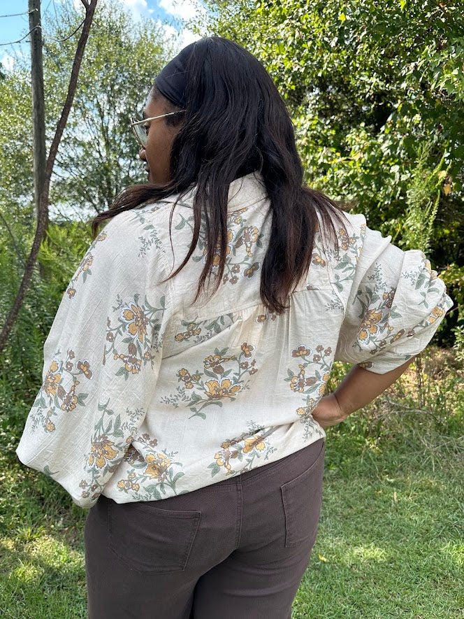 Easy, breezy, and beautifully detailed. This lightweight woven blouse features an allover floral print with soft pleating at the shoulders and back yoke to create gentle volume and movement. Finished with a classic shirt collar, button front, and buttoned cuffs, it’s the kind of top that looks just as good with denim as it does with dress pants. Perfect for work, worship, or weekend brunch.