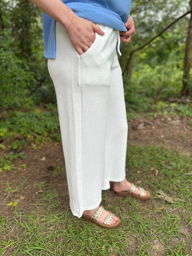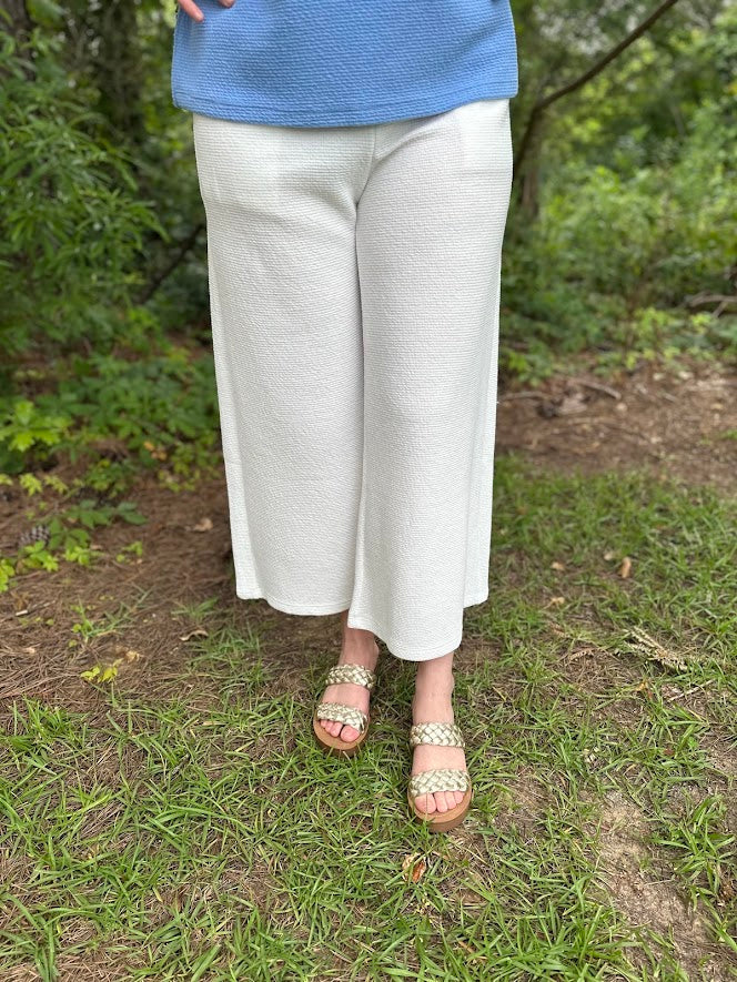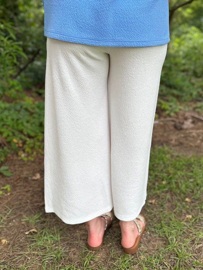 These pants are proof that comfort and polish can live in the same outfit. Crafted from a soft, textured fabric with just the right amount of drape, these ivory wide-leg pants are breezy, chic, and incredibly flattering. The pull-on waistband gives you ease without sacrificing style, and the cropped length shows off your favorite sandals.