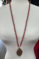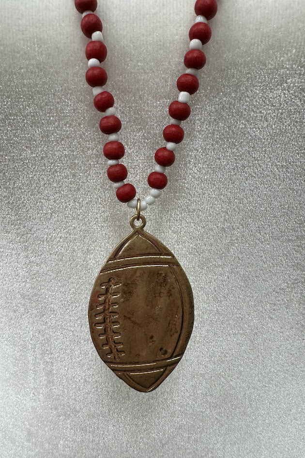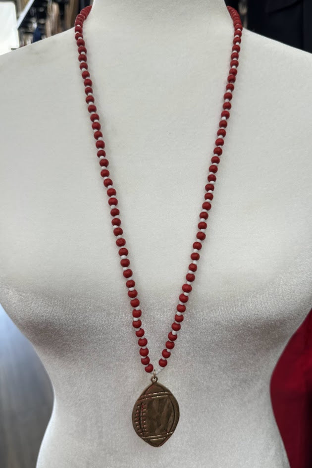 Add an easy pop of team spirit with this red beaded necklace finished with an antique-style football pendant. Lightweight, eye-catching, and perfect for tailgates, watch parties, and busy Saturdays around town.