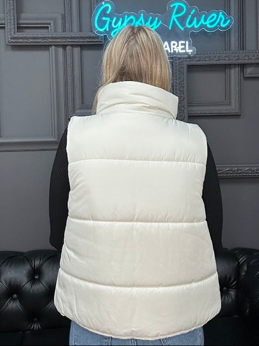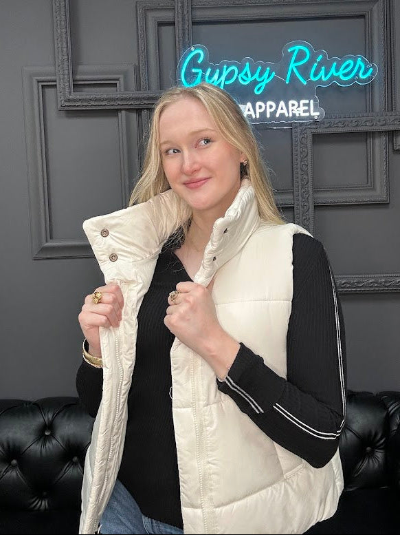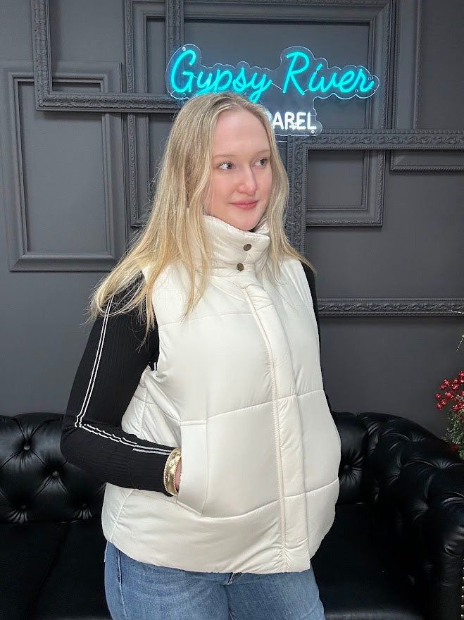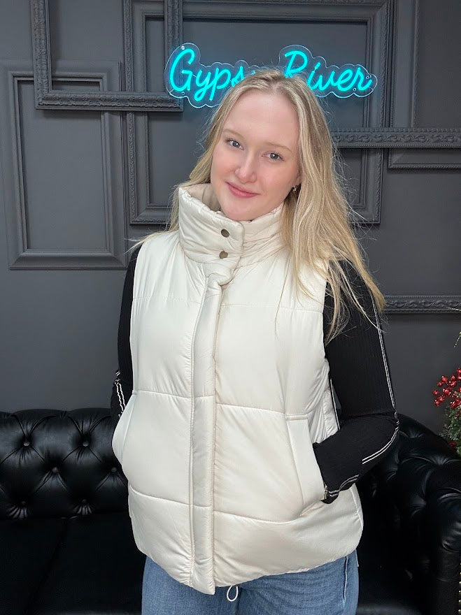 This high neck puffer vest is the perfect extra layer for those cooler days when you need warmth without the bulk. The quilted design gives it a clean, structured look, while the high collar adds that little boost of coziness we all appreciate on windy mornings.