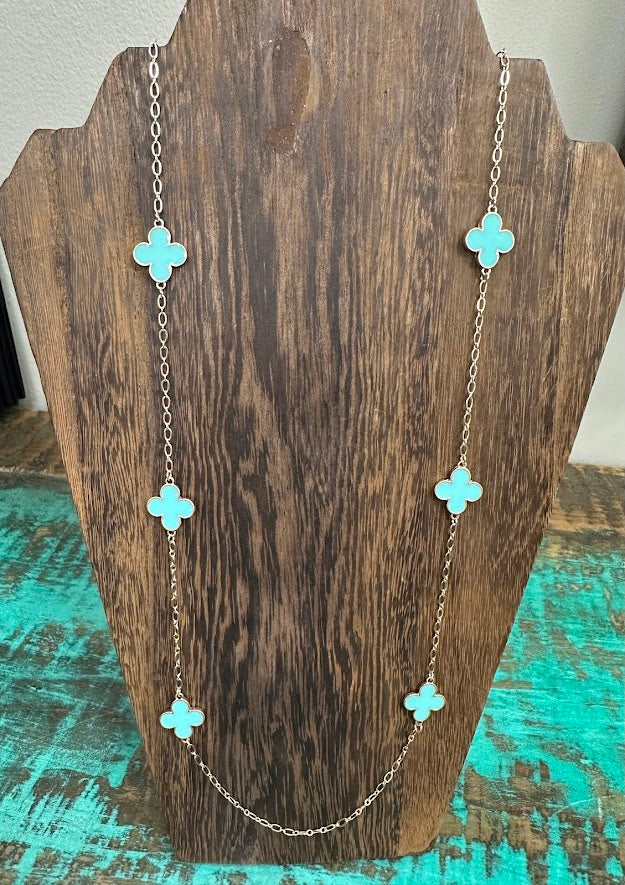 Brighten up your neckline with a pop of color and a dash of luck! Our Turquoise Clover Station Necklace features delicate gold-toned chain links punctuated by bold turquoise quatrefoil charms that add just the right amount of flair. This lightweight, longline piece is perfect for layering or wearing solo with your favorite blouse, dress, or tee. It’s a timeless style that works day to night with effortless charm.
