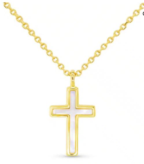 This dainty mother of pearl cross necklace features 18K gold dipped, 18" chain and channeled pendant. Chain also has an extender.