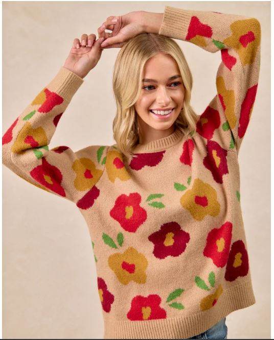 floral sweater, fall knit top, colorful sweater, women’s boutique sweater, cozy flower sweater, soft knit pullover, tan floral top, fun fall outfit, bright sweater for women, casual chic knit