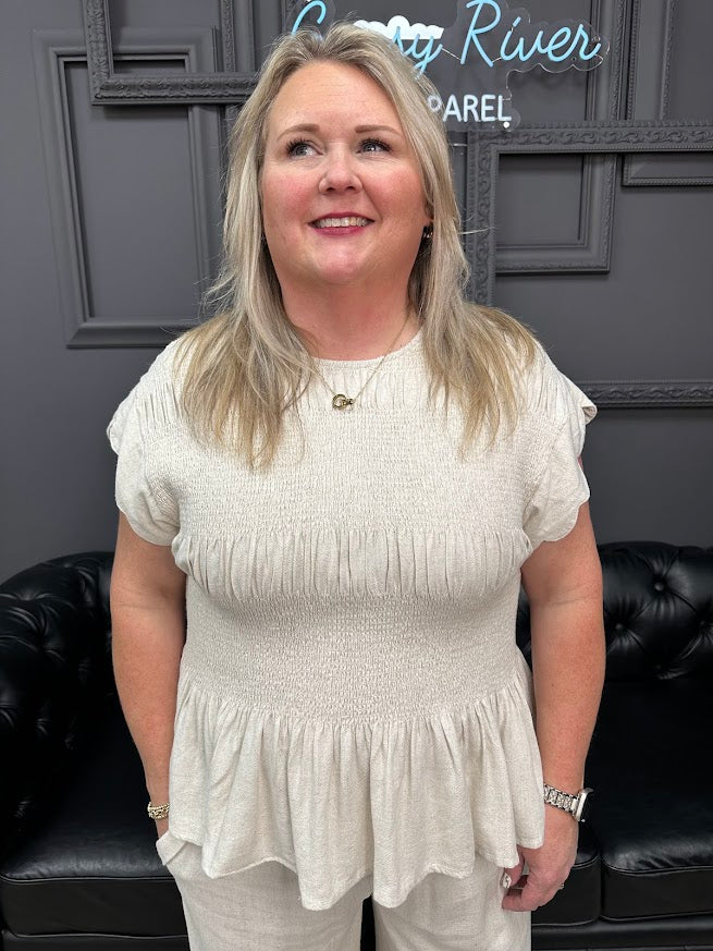 This linen blend peplum top is light, breezy, and made to flatter without feeling fussy. The smocked bodice gives it a comfortable fit, while the ruffle peplum hem and scalloped sleeves add just enough detail to make it feel special—perfect for warm days and easy styling.