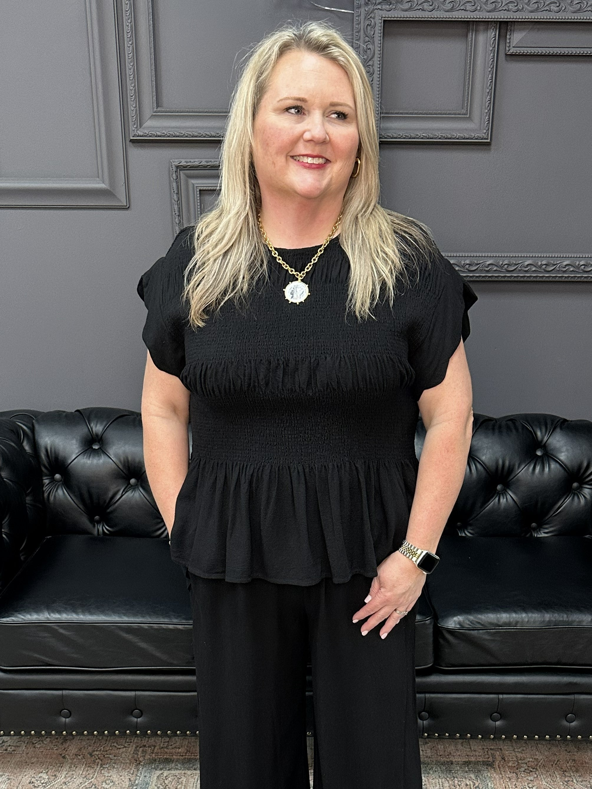 Feminine texture meets easy summer style in this linen blend smocked peplum top. The beautifully smocked bodice creates a flattering shape, while the soft ruffle peplum hem adds movement and a touch of charm.