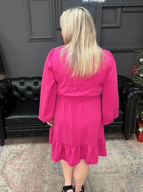 This long sleeve woven dress is the perfect mix of feminine, flowy, and easy to wear. The soft woven fabric drapes beautifully, while the elastic waistband adds gentle shape without feeling tight. The V-style neckline keeps the look flattering, and the long sleeves give it a graceful, polished feel.