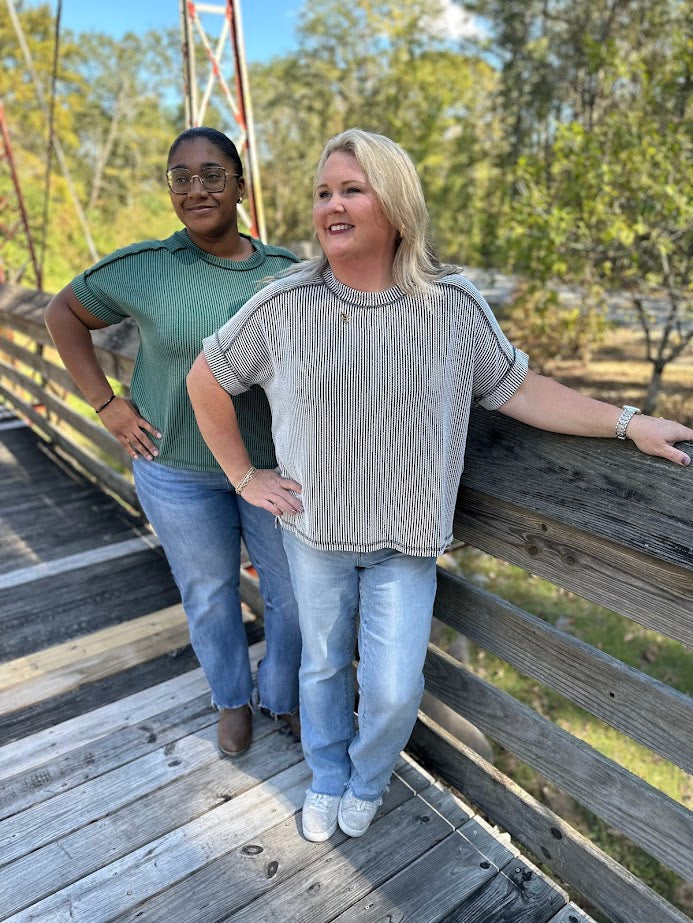 Olivia is wearing the size L/XL in Hunter Green and Laura is wearing the size S/M in the Black and White.