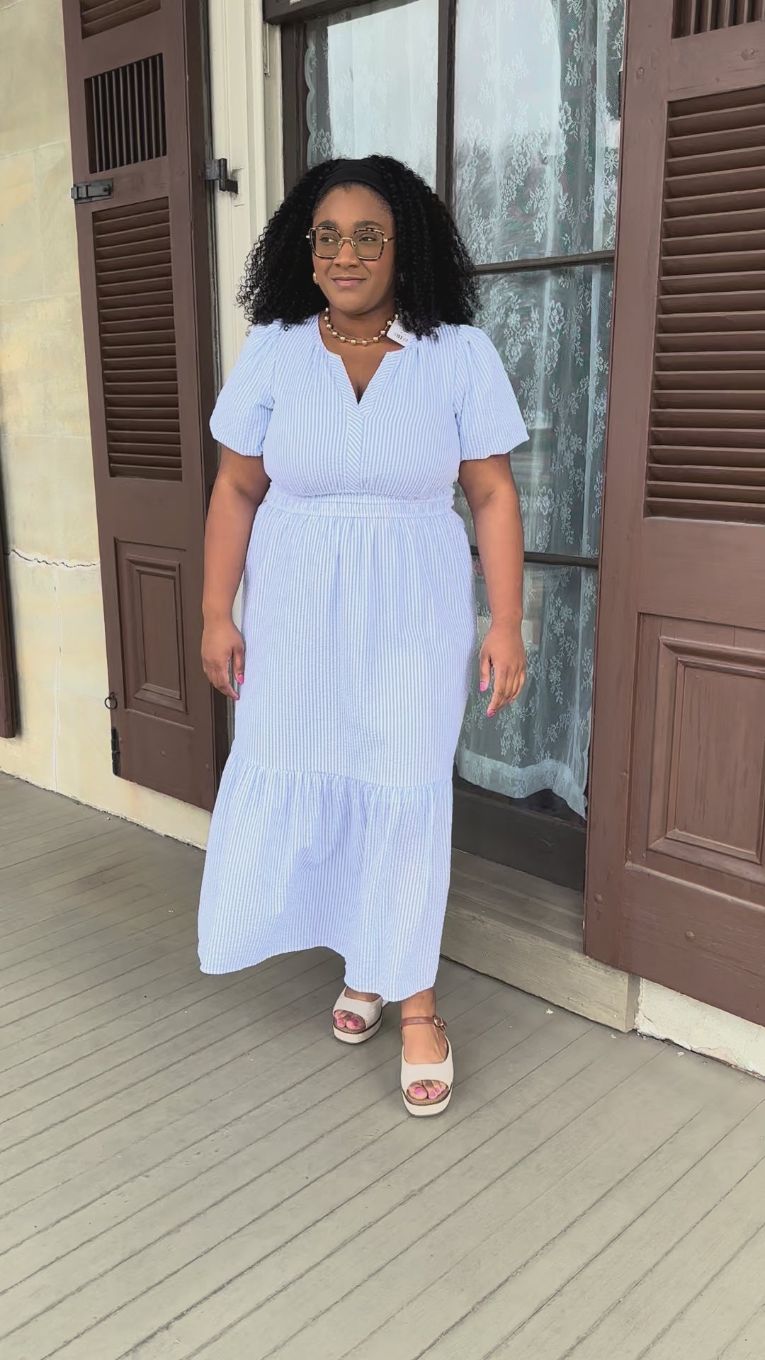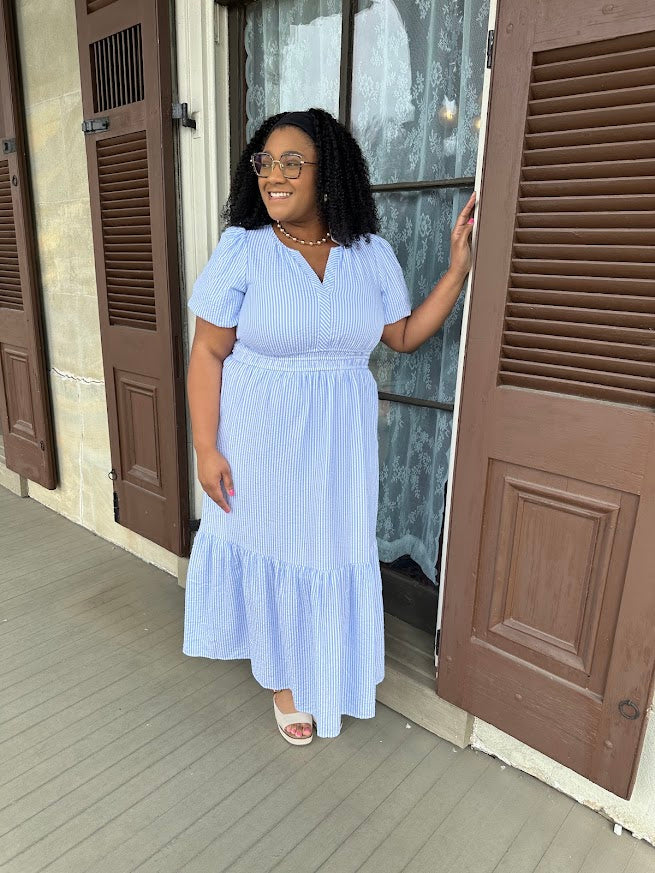Soft, flattering, and effortlessly pretty 💙 The Tracey Dress is one of those pieces you’ll reach for when you want to feel polished without overthinking it. The split V-neckline and gently puffed sleeves give it a feminine touch, while the smocked waist creates a comfortable, flattering shape that defines without feeling tight.