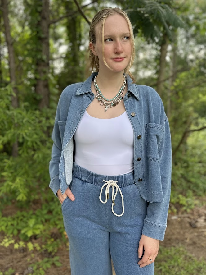 Wear the pieces together for a coordinated set look, or mix and match with your favorite tanks, tees, or denim. The neutral denim-inspired tone makes styling a breeze!
