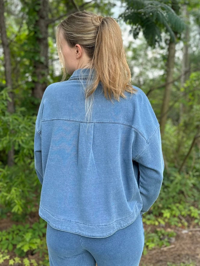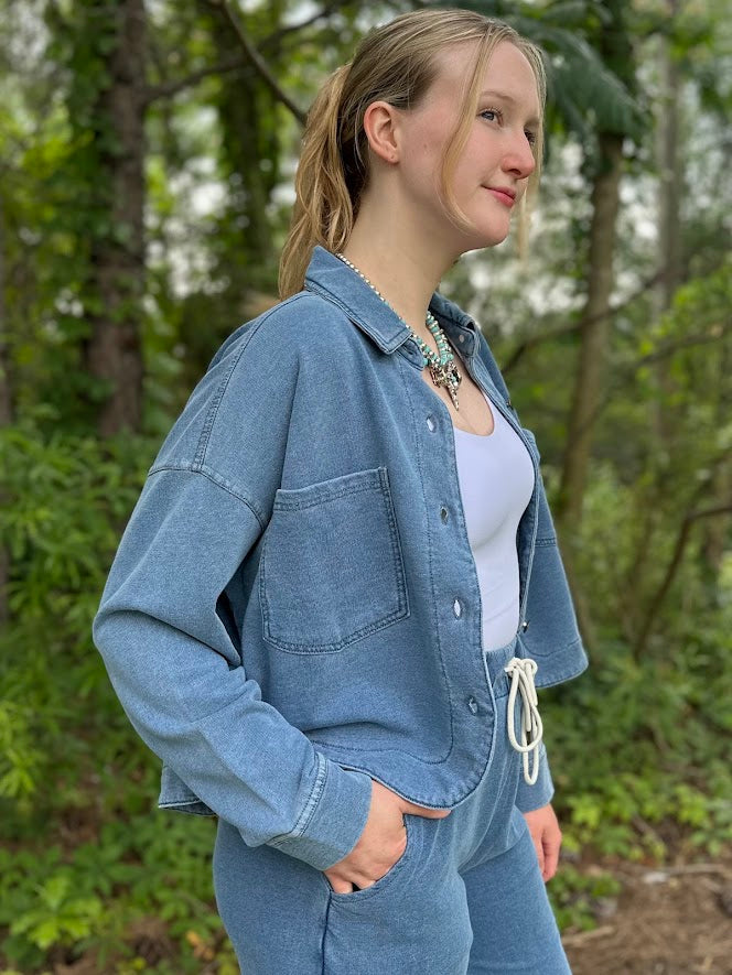 Looks like denim, feels like a dream. This two-piece set brings all the style of your favorite jean jacket and joggers—but with none of the stiffness. Made from a buttery soft knit in a washed indigo hue, the cropped button-up jacket and wide-leg drawstring pants are perfect for staying comfy and cute whether you're out running errands or lounging around.