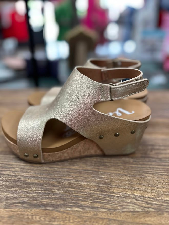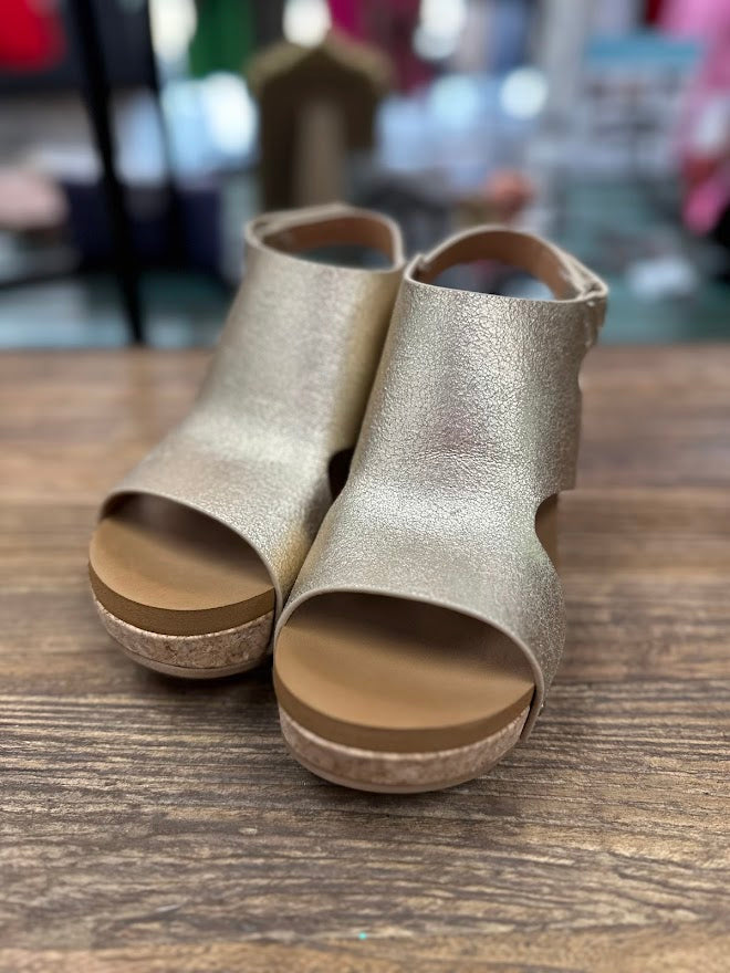 Step into style with these chic metallic wedge sandals! Featuring a stunning gold shimmer, these sandals effortlessly combine elegance and comfort. The cutout design adds a modern touch, while the cork wedge provides both height and stability. Perfect for dressing up your summer outfits or adding a hint of glam to your casual looks. The soft footbed ensures all-day comfort, making these your go-to sandals for brunch, shopping trips, or nights out. Pair them with dresses, jeans, or your favorite shorts for a versatile, stylish look.