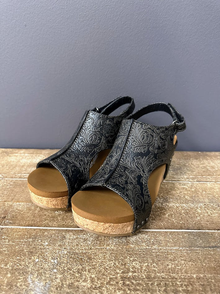 Step into comfort and style with these stunning black tooled leather wedge sandals—where western charm meets everyday wearability. The intricate floral embossing gives them that “extra” without trying too hard, while the cork wedge keeps things light and walkable all day long. A soft footbed and velcro strap closure mean you get a secure fit without sacrificing comfort. Whether you're dressing up denim or giving your sundresses a little sass, these wedges are ready for whatever your day (or night) holds.