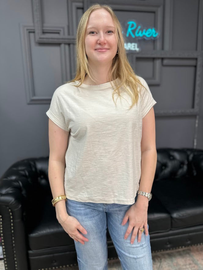 Your grab-and-go everyday tee. The textured slub knit gives it that effortless look, while the cuffed short sleeves and easy drape make styling simple—front tuck with denim, layer under a jacket, or keep it casual and breezy.