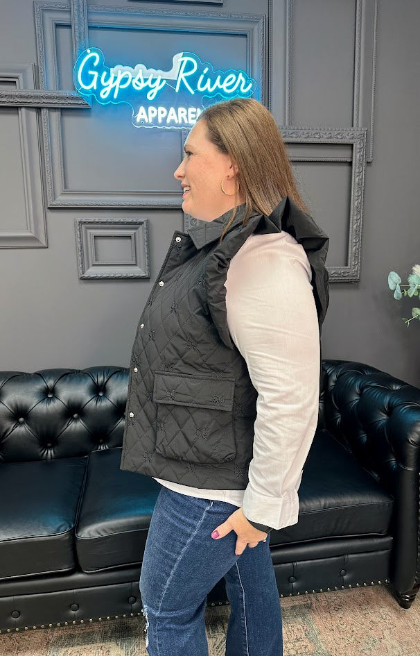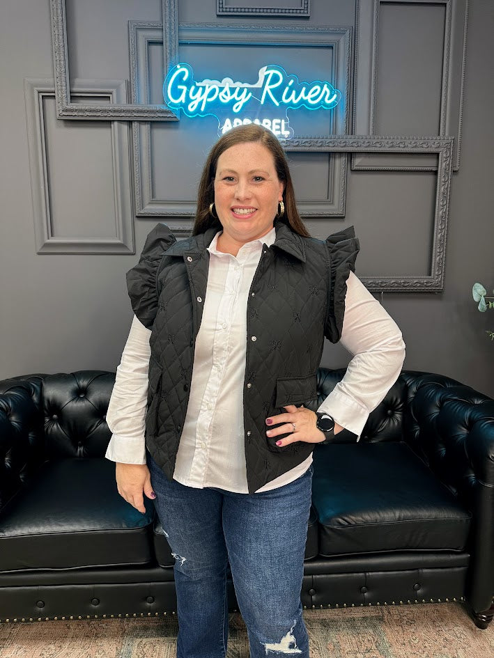 Ruffled Cap Sleeves Quilted Vest with Bow Embroidery