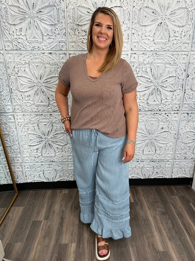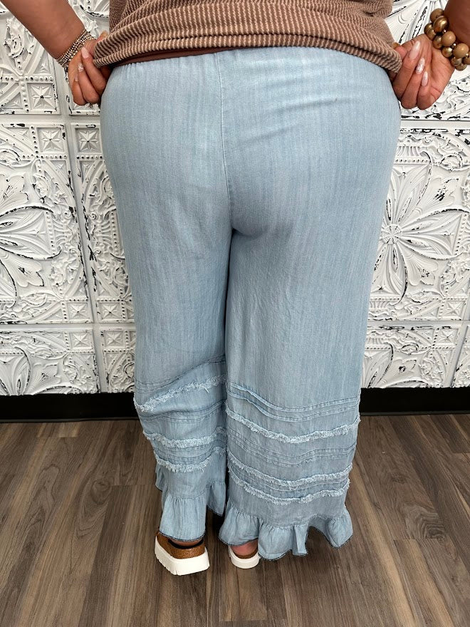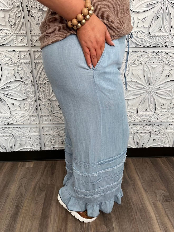 Reg/Curvy Wide Leg Chambray Pant with Raw Seam Details