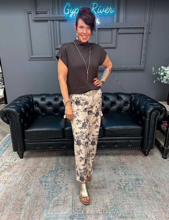 Fall Floral 3/4 Sleeve Top with Scallop Accent
