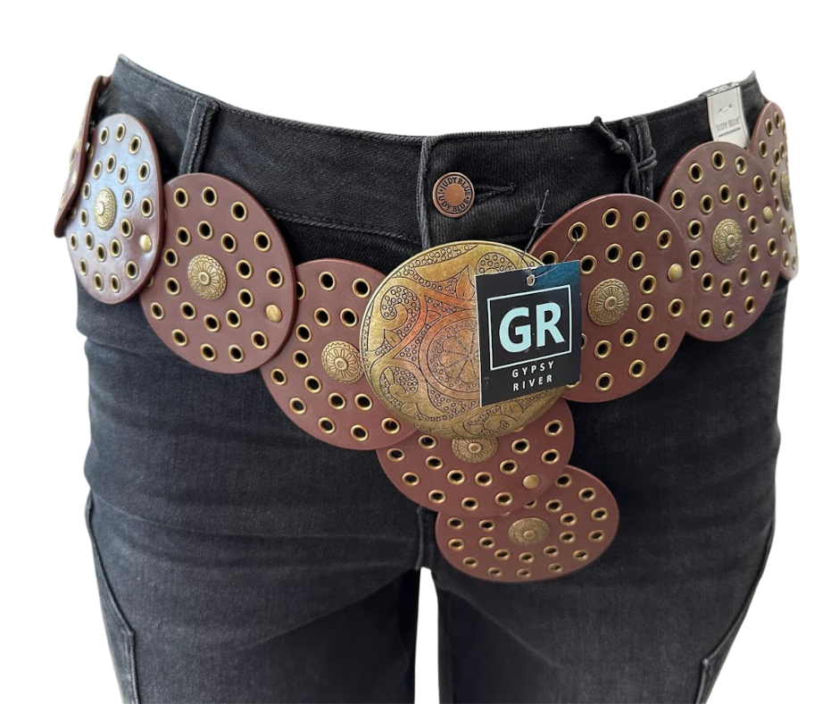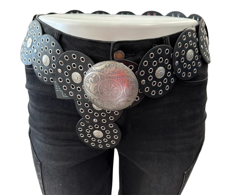 Turn heads and cinch your style with this bold Western-inspired concho belt. Featuring oversized round conchos linked together and finished with an engraved statement buckle, this belt brings instant flair to denim, dresses, or skirts. Designed to sit at the waist or hips, it’s an eye-catching piece that’s more than just an accessory—it’s a conversation starter. Available in classic brown with antique gold or striking black with silver, this belt adds a touch of rustic glam to any outfit.