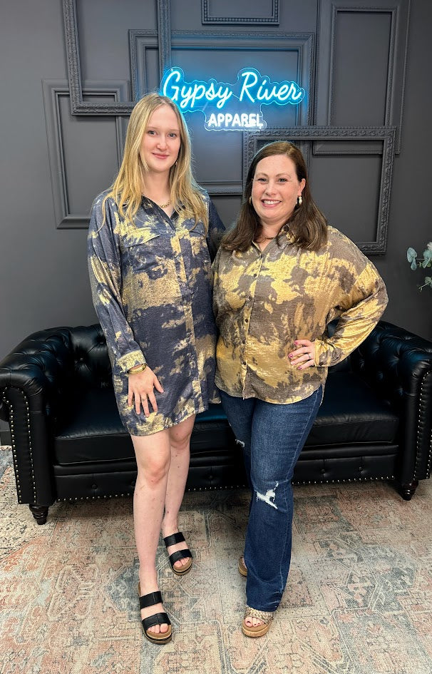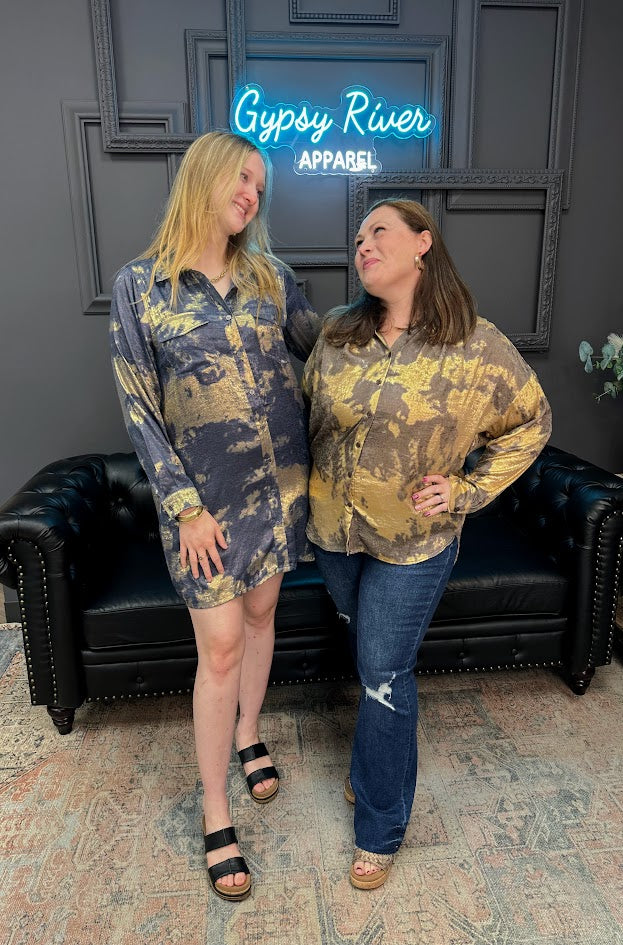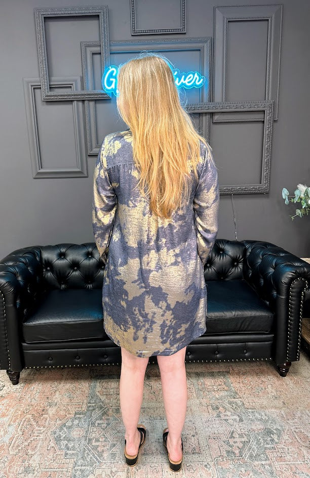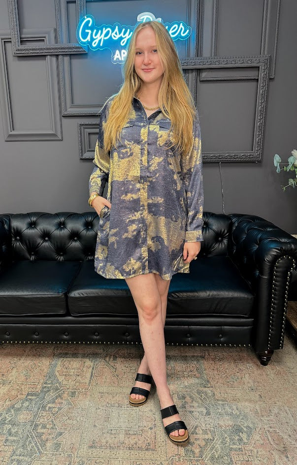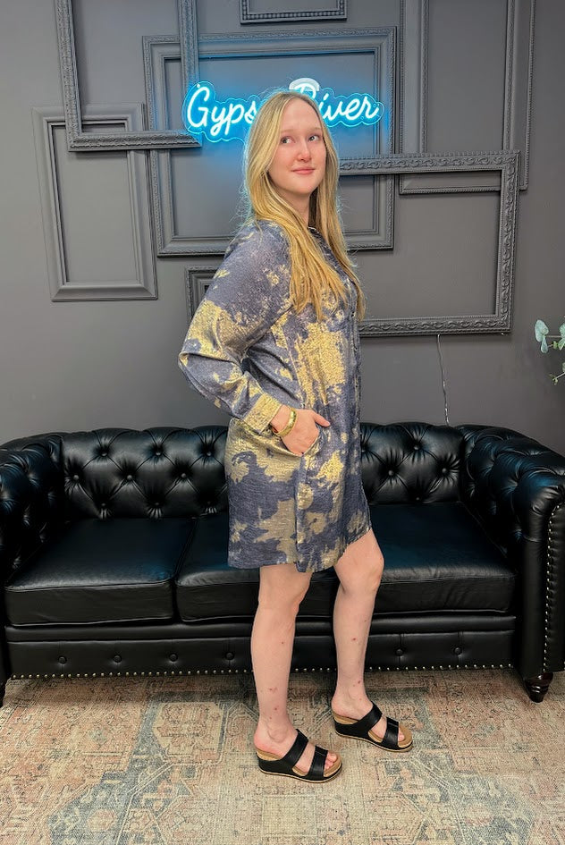 Easy, effortless, and oh-so-chic—this Metallic Tie-Dye Print Mini Dress with Chest Pockets is made for days when you want to look put together without even trying. The relaxed fit keeps it comfy, while the button-front detail and subtle collar add a touch of polish. With side pockets (yes, pockets!) and a bold tie-dye pattern, this dress is ready for anything from casual lunches to date night.