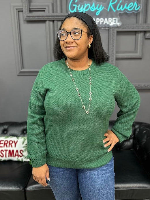 This textured knit sweater delivers soft, everyday comfort with a classic crew neckline and an easy silhouette that pairs beautifully with denim. Its cozy feel and timeless style make it a perfect grab-and-go piece for workdays, weekends, and all the festive moments in between.