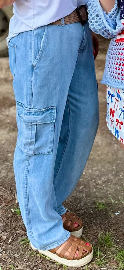 Upgrade your casual style with these light wash cargo wide-leg pants! Featuring a relaxed fit and soft denim fabric, these pants are designed for both comfort and fashion. The utility-inspired cargo pockets add a functional yet stylish touch, while the wide-leg silhouette brings a laid-back vibe. Pair them with a simple tee and sandals for a weekend-ready look or dress them up with a blouse and wedges for a chic, off-duty style.